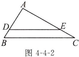 例2(教材典题)如图4-4-2,D,E分别是△ABC的边AB,AC上的点,DE//BC,AB=7,AD=5,DE=10,求BC的长.