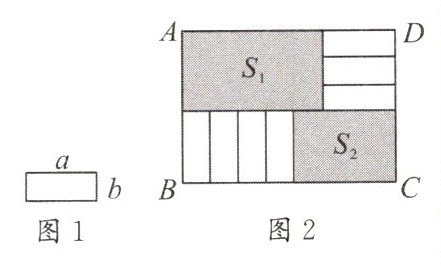 【拓展延伸】(3)现有7张如图1所示的长为$ a $,宽为$ b $的小长方形纸片,将这7张长方形纸片按图2所示放置在大长方形$ ABCD $中(纸片间无重叠,无间隙),大长方形中未被纸片覆盖的区域设为$ S_{1} $,$ S_{2} $,若当$ AD $的长度变化时,$ S_{1} $与$ S_{2} $的差始终为定值,求$ a $与$ b $的数量关系。