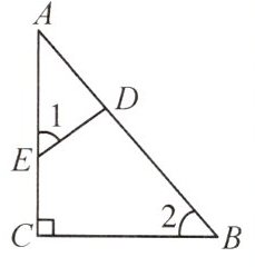 【变式4】(人教教材P14T2)如图,在$\triangle ABC$中,$\angle C = 90^{\circ}$,点$D$,$E$分别在边$AB$,$AC$上,且$\angle 1 = \angle 2$,$\triangle ADE$是直角三角形吗?为什么?