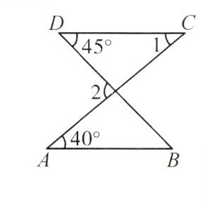 【例2】(人教教材P17T5)如图,$AB// CD$,$\angle A=40^{\circ}$,$\angle D=45^{\circ}$.求$\angle 1$和$\angle 2$的度数.
