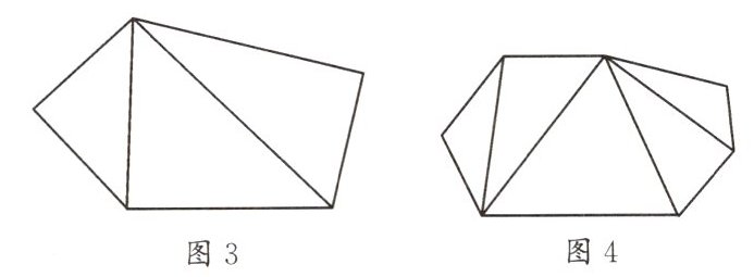 (3)将n边形$(n≥3)$用互不相交的对角线分割成若干个三角形,构成类似图4的图案,设这种分割中图案的顶点数为V,边数为E,区域数为F(区域之间不重合),则V,E,F的数量关系为