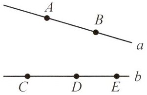 5. (人教教材P4T5)如图,已知点$A$,$B$在直线$a$上,点$C$,$D$,$E$在直线$b$上。以点$A$,$B$,$C$,$D$,$E$中的任意三点作为三角形的顶点,一共可以组成多少个三角形?分别写出这些三角形。