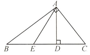 【例3】(人教教材P3T2)如图,在$△ABC$中,$∠BAC$是直角,$AD⊥BC$,垂足为$D$,点$E$在线段$BD$上,找出图中的锐角三角形、直角三角形和钝角三角形。