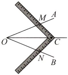 2. (人教教材P38T2)工人师傅常用角尺平分一个任意角。如图,在$\angle AOB$的边$OA$,$OB$上分别取$OM = ON$,移动角尺,使角尺两边相同的刻度分别与点$M$,$N$重合。过角尺顶点$C$的射线$OC$便是$\angle AOB$的平分线。为什么?
