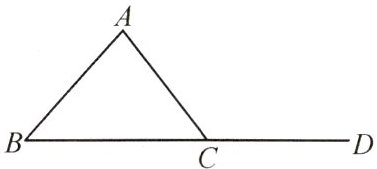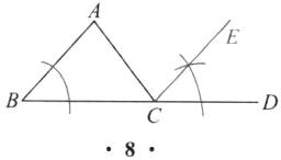 1. 如图,点$D$是$△ABC$的边$BC$延长线上的一点,以点$C$为顶点,射线$CD$为一边,在$BD$上方利用尺规作$∠DCE$,使得$∠DCE=∠B$。(要求:尺规作图,不写作法,保留作图痕迹)
