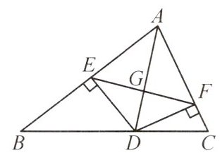 【例3】如图,$AD$是$\triangle ABC$的角平分线,$DE \perp AB$,$DF \perp AC$,垂足分别为$E$,$F$,连接$EF$,$EF$与$AD$相交于点$G$。$AD$与$EF$垂直吗?证明你的结论。