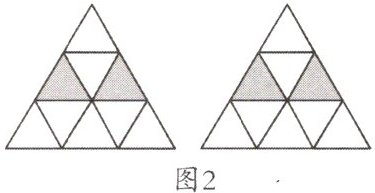(2)将图2中其余小三角形涂黑两个,使整个被涂黑的图案构成一个轴对称图形(画出两种不同的).
