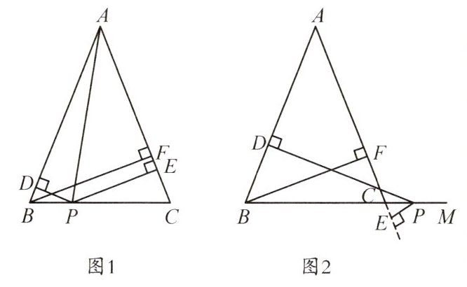 5.(中考新考法·类比思想)如图,在△ABC中,AB=AC,点P是射线BC上的一个动点,过点P作PD⊥AB,PE⊥AC,垂足分别为点D,E,BF为△ABC的腰AC上的高。
