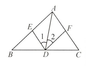 【例3】(人教教材P10T8)如图,在△ABC中,AD是它的角平分线,DE//AC,DE交AB于点E,DF//AB,DF交AC于点F.图中∠1与∠2有什么关系? 为什么?