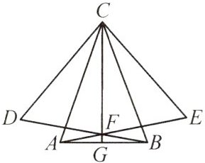 【例3】(人教教材P93T13)如图,$△ABC$是等腰三角形,$AC=BC,△BCD$和$△ACE$是等边三角形,AE与BD相交于点F,连接CF并延长,交AB于点G.求证:G为AB的中点.