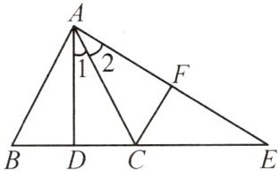10. 如图,点$C$是$\triangle ABE$的边$BE$上的一点,点$F$在$AE$上,点$D$是$BC$的中点,且$AB = AC = CE$,对于下列结论:①$AD\perp BC$;②$CF\perp AE$;③$\angle 1=\angle 2$;④$AB + BD = DE$。其中正确的结论有(