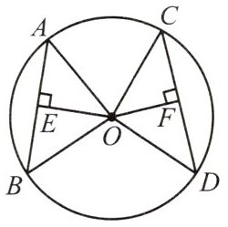 (2)如果$OE=OF$,那么$\overset{\frown }{AB}$与$\overset{\frown }{CD}$的大小有什么关系?$AB$与$CD$的大小有什么关系? 为什么?$∠AOB$与$∠COD$呢?