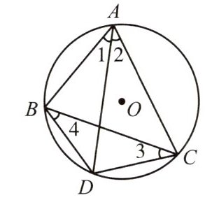 【变式4】如图,点$A$,$B$,$C$在$\odot O$上,点$D$是$\overset{\frown}{BC}$的中点.求证:$\angle 1=\angle 2=\angle 3=\angle 4$.