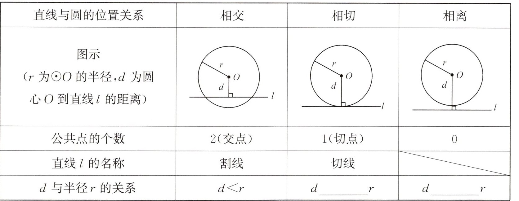 当直线$l$和圆$\odot O$相交时,$d\lt r$;当直线$l$和圆$\odot O$相切时,$d = r$;当直线$l$和圆$\odot O$相离时,$d\gt r$。