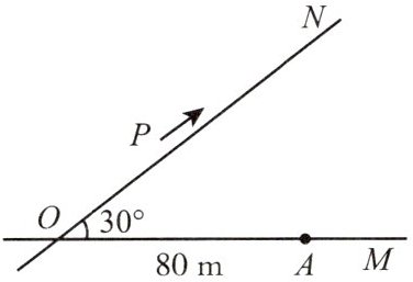 7. 如图,有两条公路$OM$,$ON$相交成$30^{\circ}$角,沿公路$OM$方向离点$O\ 80\mathrm{m}$处有一所学校$A$。当重型运输卡车$P$沿道路$ON$方向行驶时,在以点$P$为圆心,$50\mathrm{m}$长为半径的圆形区域内都会受到卡车噪声的影响,已知重型运输卡车$P$沿道路$ON$方向行驶的速度为$5\mathrm{m/s}$。