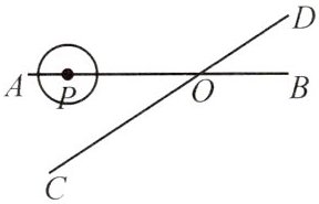 6. 如图,直线$AB$,$CD$相交于点$O$,$\angle AOC = 30^{\circ}$,半径为$1\mathrm{cm}$的$\odot P$的圆心在射线$OA$上,开始时,$PO = 6\mathrm{cm}$,如果$\odot P$以$1\mathrm{cm/s}$的速度从点$A$向点的方向移动,那么当$\odot P$的运动时间$t(\mathrm{s})$满足什么条件时,$\odot P$与直线$CD$相切?