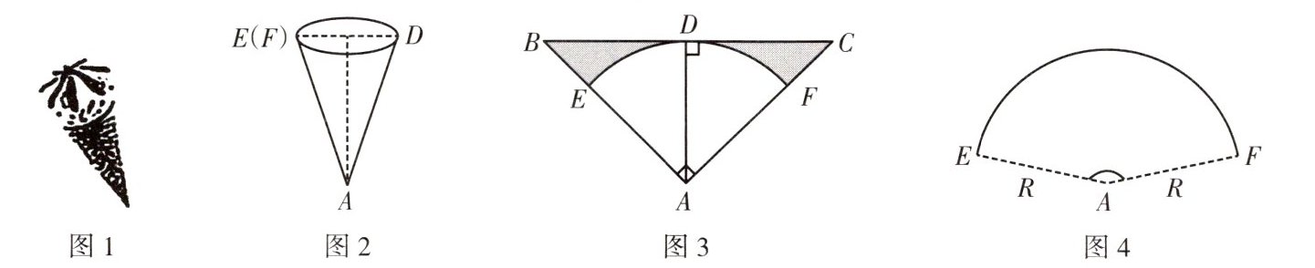 9.图1中的某种冰激凌的外包装可以视为圆锥(如图2),制作这种外包装用如图3所示的等腰三角形材料,其中$AB=AC$,$AD\perp BC$,将扇形EAF围成圆锥时,AE,AF恰好重合,已知圆锥的底面圆直径$ED=6cm$,母线长$AD=12cm$.