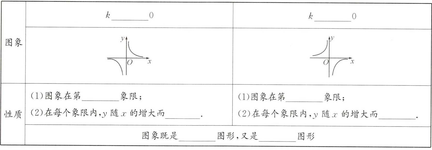 【例1】(1)反比例函数$y=-\frac{5}{x}$的图象在第____象限,在每个象限内,$y$随$x$的增大而____.