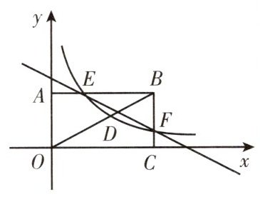如图,在平面直角坐标系中,矩形$OABC$的两边$OC$,$OA$分别在坐标轴上,且$OA = 2$,$OC = 4$,连接$OB$. 反比例函数$y=\frac{k_1}{x}(x>0)$的图象经过线段$OB$的中点$D$,并与$AB$,$BC$分别交于点$E$,$F$. 一次函数$y = k_2x + b$的图象经过$E$,$F$两点.