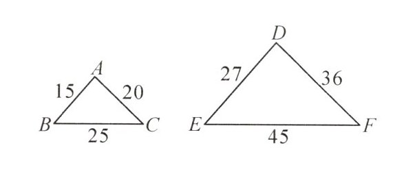 证明: $\because \frac{AB}{DE}=\frac{15}{27}=\frac{5}{9},\frac{AC}{DF}=\frac{20}{36}=\frac{5}{9},\frac{BC}{EF}=\frac{25}{45}=\frac{5}{9}$,