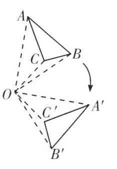 几何语言:OA = OA',OB = OB',OC = OC’,∠AOA' = ∠BOB' = ∠COC’,△ABC ≌ △A'B'C'。