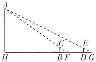 3.(北师教材九上P104“读一读”改编)如图,小明要测量操场上旗杆的高度AH。立两根高1m的标杆BC和DE,两杆相距$BD=15m$,D,B,H三点共线。已知$BF=2m$,A,C,F三点共线;$DG=3m$,A,E,G三点也共线,求旗杆的高度AH及HB的距离。