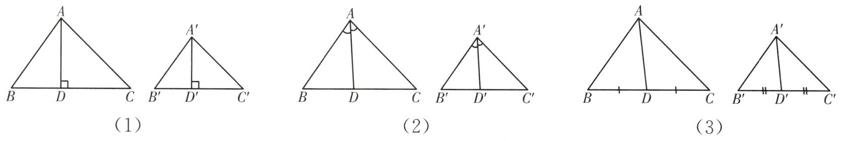 如图,下列三组图中,$\triangle ABC \backsim \triangle A'B'C'$,且相似比为$k$,请分别求它们对应高、对应角平分线及对应中线的比.