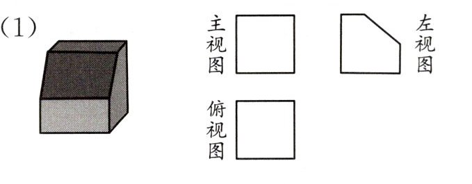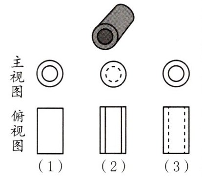 (1)中的主视图正确,俯视图错误,俯视图中“内圆”的轮廓线看不到,应用虚线表示出来;