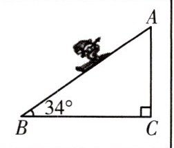 【例3】如图,一名滑雪运动员沿着倾斜角为$34^{\circ}$的斜坡,从点$A$滑行至点$B$,已知$AB = 500\ \text{m}$,则这名滑雪运动员的高度下降了