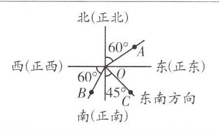 |方位角是从正北或正南方向到目标方向所形成的小于$90^{\circ}$的角.|!|(1)点A在点O的