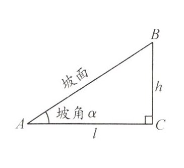 (2)坡角的正切值叫坡度,记作i,即坡度$i=\tan\alpha=\frac{h}{l}$. |!|如左图,坡AB的坡度为i,坡角为$\alpha$.