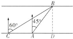 【变式1】如图,某社会实践活动小组实地测量两岸互相平行的一段河的宽度,在河的南岸点A处,测得河的北岸边点B在其北偏东$45^{\circ}$方向上,然后向西走60m到达C点,测得点B在点C的北偏东$60^{\circ}$方向,求这段河的宽度.