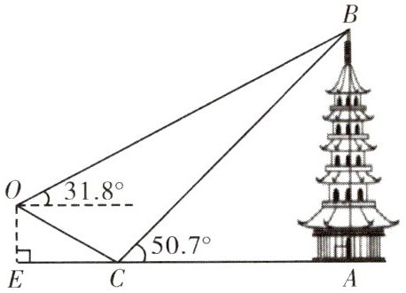 3.黄鹤楼濒临万里长江,雄踞蛇山之巅,享有“天下江山第一楼”之称.小黎欲测量黄鹤楼主楼AB的高度,如图,他在黄鹤楼对面斜坡CD的坡底C处用测角仪测得点B的仰角为50.7°,在坡顶D处用测角仪测得点B的仰角为31.8°,已知斜坡的坡角∠DCE=30°,斜坡CD长24m,测角仪高度忽略不计,求黄鹤楼主楼的高度.(点A,B,C,D,E在同一平面内,结果保留整数,参考数据:√3≈1.73,sin50.7°≈0.77,cos50.7°≈0.63,tan50.7°≈1.22,sin31.8°≈0.53,cos31.8°≈0.85,tan31.8°≈0.62)
