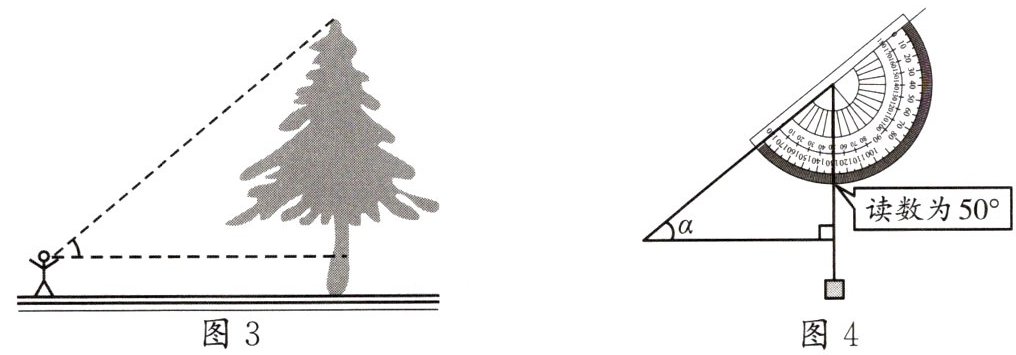 如图3,小王站在离古树一定距离的地方,将这个仪器用手托起,拿到眼前,使视线沿着仪器的直径刚好到达古树的最高点.如图4,利用测角仪,测量后计算得出仰角α,α=______.测出眼睛到地面的距离AB,AB=1.54m.测出所站地方到古树底部的距离BD,BD=10m.