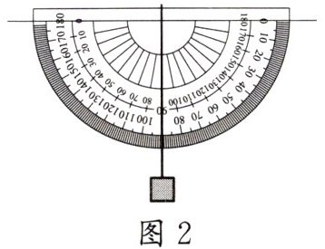 自制测角仪,把一根细线固定在半圆形量角器的圆心处,细线的另一端系一个小重物,制成一个简单的测角仪,利用它可以测量仰角或俯角,如图2所示.准备皮尺.