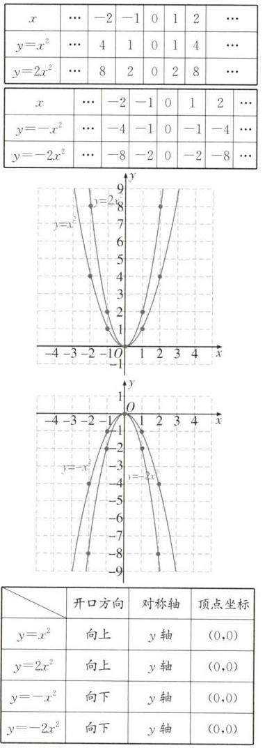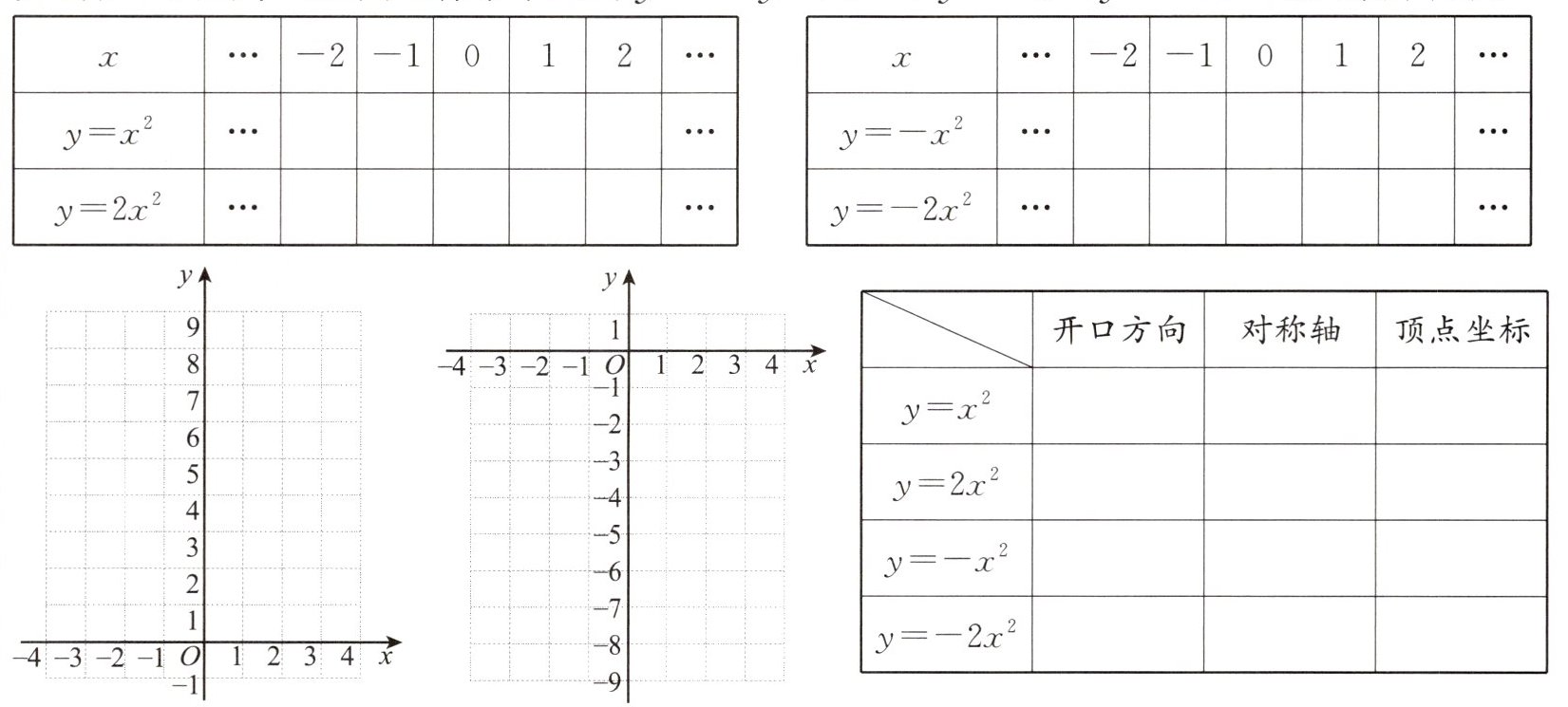 分别在下面的平面直角坐标系中画出$y = x^{2}$,$y = 2x^{2}$和$y = -x^{2}$,$y = -2x^{2}$的图象并填表。