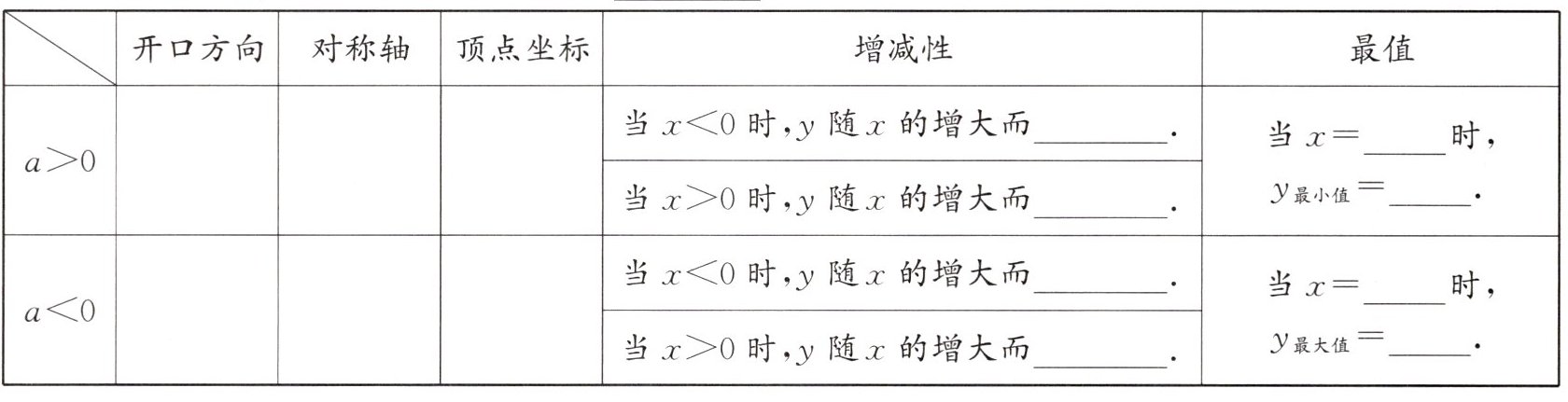 抛物 向上 向下 $y$轴 $y$轴 $(0,0)$ $(0,0)$ 减小 增大 增大 减小 $0$ $0$ $0$ $0$