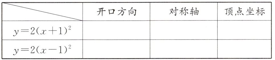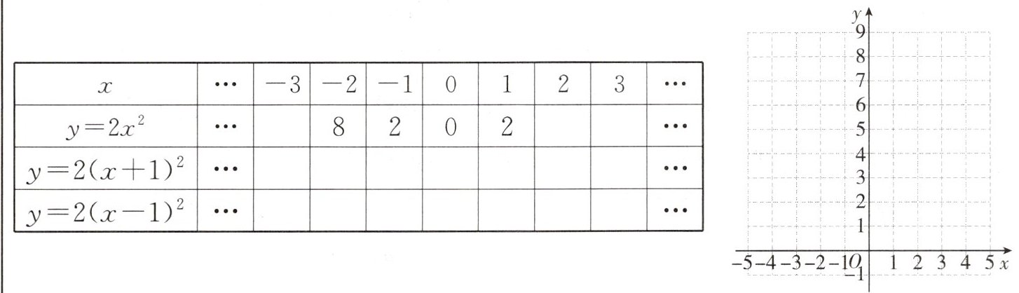 3. 在下面的平面直角坐标系中画出$y = 2(x + 1)^2$和$y = 2(x - 1)^2$的图象,并填表.