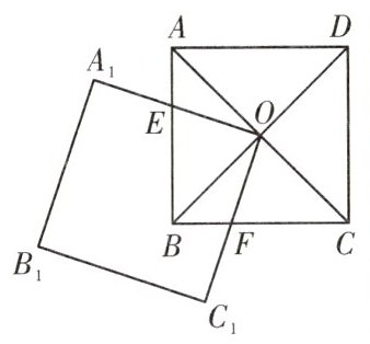【例1】(北师九上教材P25T4改编)如图,正方形ABCD的边长为2,对角线相交于点O,点O又是正方形$A_{1}B_{1}C_{1}O$的一个顶点,而且这两个正方形的边长相等,正方形$A_{1}B_{1}C_{1}O$绕点O转动.