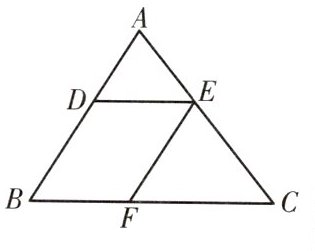 5. (北师教材九上P85T4)如图,在$ \triangle A B C $中,$ D $,$ E $,$ F $分别是$ A B $,$ A C $,$ B C $上的点,且$ D E // B C $,$ E F // A B $,$ A D : D B = 2 : 3 $,$ B C = 20 \mathrm { ~cm } $,求$ B F $的长。