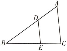 4. (北师教材九上P85T3)如图,在$ \triangle A B C $中,$ D $,$ E $分别是$ A B $和$ B C $上的点,且$ D E // A C $,$ \frac { A B } { B E } = \frac { A C } { E C } $,$ \frac { A B } { A C } = \frac { 5 } { 3 } $,求$ \frac { A B } { B D } $。