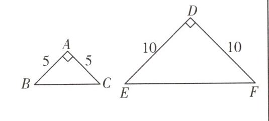 $ \therefore \frac { A B } { D E } = \frac { A C } { D F } = \frac { B C } { E F } = \frac { 5 } { 10 } = \frac { 1 } { 2 } , \angle A = \angle D = 90 ^ { \circ } , \angle B = \angle E = \angle C = \angle F = 45 ^ { \circ } $,