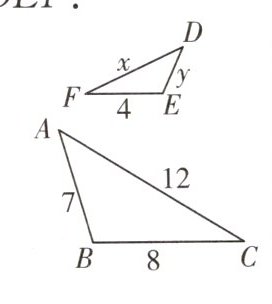 $ \therefore \frac { A B } { D E } = \frac { A C } { D F } = \frac { B C } { E F } $, 即 $ \frac { 7 } { y } = \frac { 12 } { x } = \frac { 8 } { 4 } $,