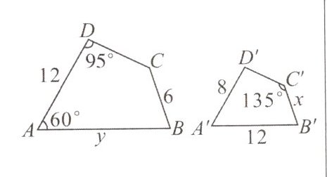 $\therefore \frac{6}{x} = \frac{12}{8} = \frac{y}{12}$, 解得 $x=4$, $y=18$.