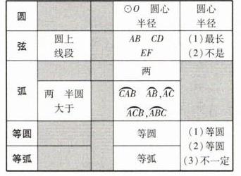 | 等圆 | 能重合的两个圆 | | 因为 $ \odot O $ 与 $ \odot O' $ 的半径相等,所以 $ \odot O $ 与 $ \odot O' $ 是______ | (1)半径相等的圆是______;(2)等弧只存在于同圆或______中;(3)长度相等的弧______是等弧 |