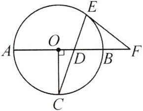 10.(2024·海珠区期中)如图,AB为$\odot O$的直径,$OC⊥AB交\odot O$于点C,D为OB上一点,延长CD交$\odot O$于点E,延长OB至点F,使$DF= EF$.
