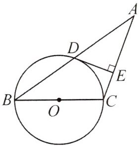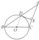 8.(结合中位线证切线)(2024·天河区月考)如图,在$△ABC$中,D为AB的中点,以BC为直径的$\odot O$与底边AB相交于点D,过点D作$DE⊥AC$,垂足为E.求证:DE为$\odot O$的