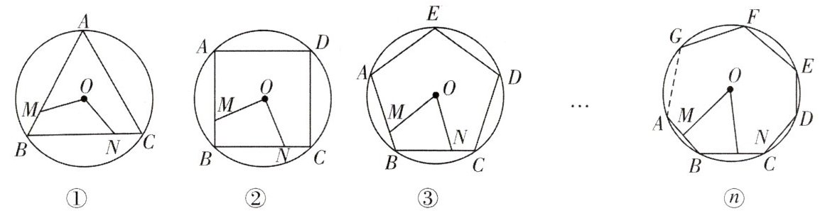 11. 【数学探究与综合】如图①,②,③,…,ⓝ,M,N分别是⊙O的内接正三角形ABC,正方形ABCD,正五边形ABCDE,…,正n边形ABCDE…的边AB,BC上的点,且BM= CN,连接OM,O