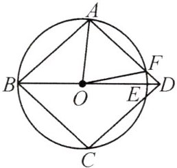 18. 如图,在四边形ABCD中,AB//CD,点O在BD上,以点O为圆心的圆恰好经过A,B,C三点,⊙O交BD于点E,交AD于点F,且$\overset{\frown}{AE}= \overset{\frown}{CE}$,连接OA,OF.