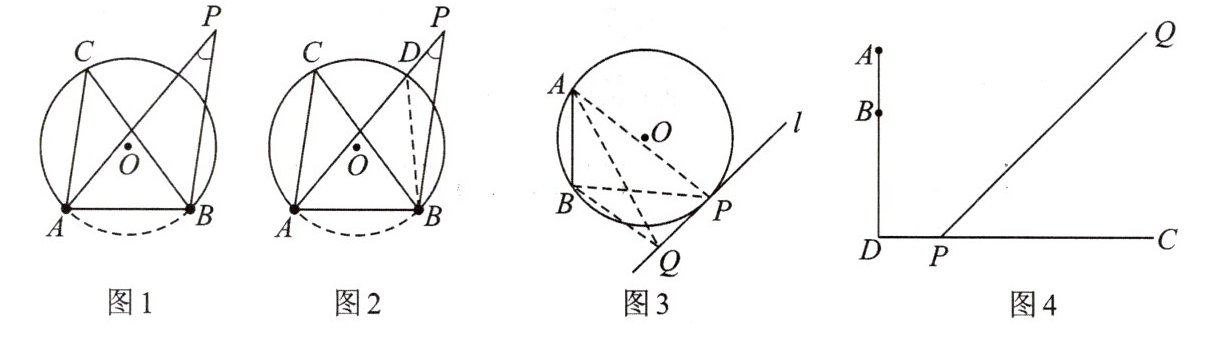 (2)如图 3,已知线段$AB与直线l$,在直线$l上取一点P$,过$A$,$B$两点,作$\odot O使其与直线l$相切,切点为$P$,不妨在直线上另外任取一点$Q$,连接$AQ$,$BQ$,请你判断$\angle APB与\angle AQB$的大小关系,并说明理由.